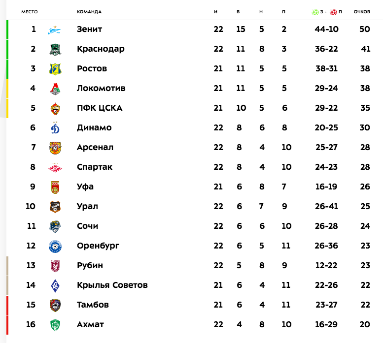 Перед началом этого матча турнирная таблица РПЛ выглядит так: