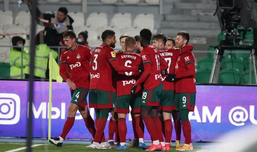 Футболисты «Локомотива» празднуют гол Гжегожа Крыховяка