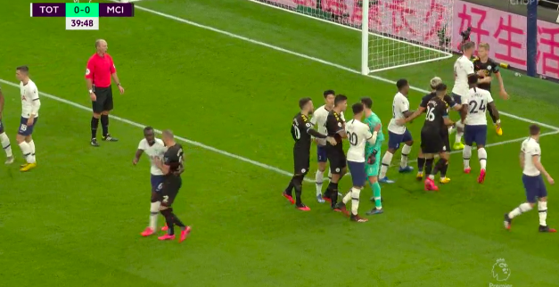 Деле Алли принял мяч после длинной передачи из глубины поля, ворвался в штрафную «Мансити» и нанес слабенький удар в створ ворот. Эдерсон в прыжке остановил мяч и зафиксировал его (хотя и не с первого раза). Однако спустя пару секунд выясняется, что судья увидел микроскопический офсайд, так что рывок Алли в любом случае был бессмысленным.