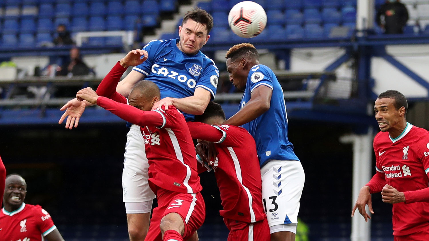 «Эвертон» тоже зарабатывает штрафной, но Мина находился в офсайде, и ни к чему не приводит штрафной.