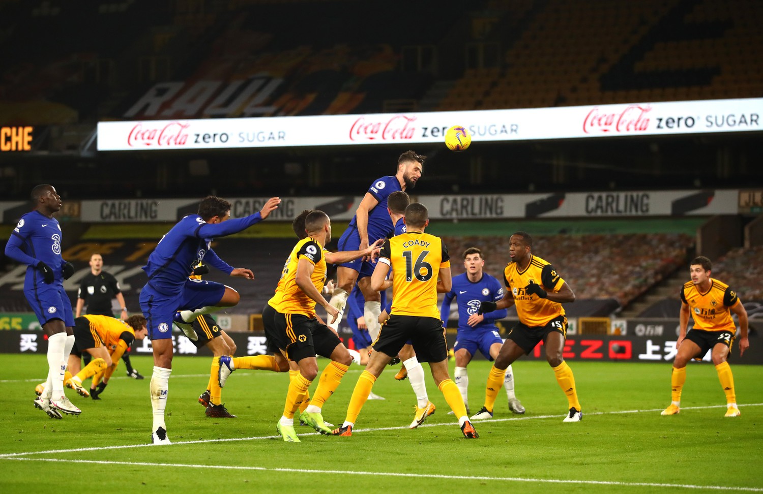 Опасно! Чилуэлл с углового навесил во вратарскую, Жиру выпрыгнул выше всех и пробил головой над перекладиной!