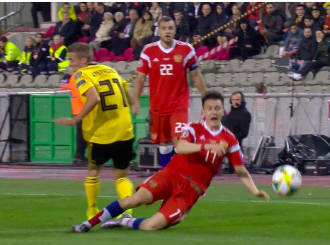 Миранчук пытался обыграть соперника у чужой лицевой. Мяч, к сожалению, покинул поле от ноги российского игрока.