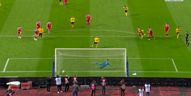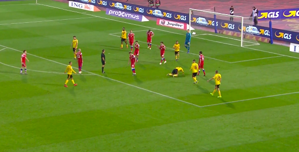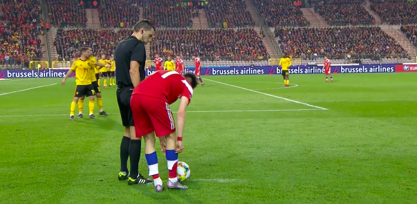Ахметов сфолил на бельгийце слева от нашей штрафной — отсюда можно даже пробить.