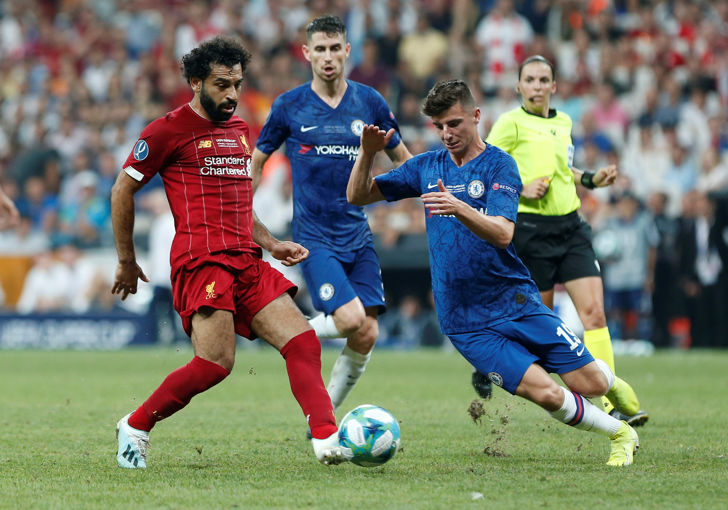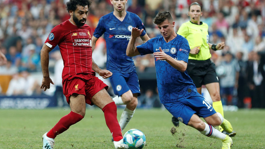 Ван Дейк исполнил длинную передачу на правый фланг атаки, там Салах перехватывает мяч, но защитники «Челси» на месте.