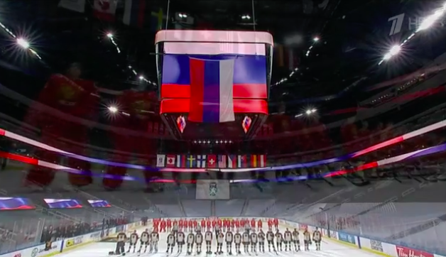 Команды собрались в круг, чтобы произнести последние слова перед началом матча. Российские хоккеисты завершили свою беседу в круге мощным ревом. Ух!