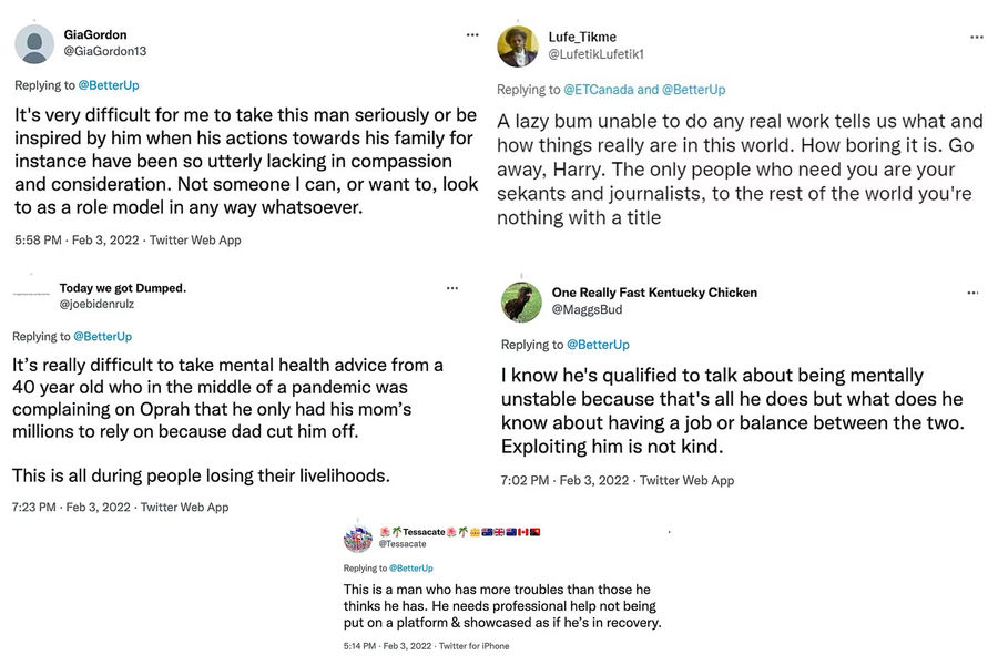 «Эх! О чем, черт возьми, он говорит? Он никогда в жизни не работал на тяжелой работе», «Очень трудно принимать советы по психическому здоровью от 40-летнего человека, который в разгар пандемии жаловался на шоу Опры Уинфри, что у него теперь есть только мамины миллионы, потому что отец его бросил. В это время люди в принципе теряли средства к существованию», «Когда он 25 лет просидит в одном и том же сером офисе с понедельника по пятницу, толкая бумаги, чтобы руководители получали больше денег, тогда он будет достоин моего внимания. А пока вы даете ему миллионы за это — это оскорбительно», — пишут пользователи Twitter.