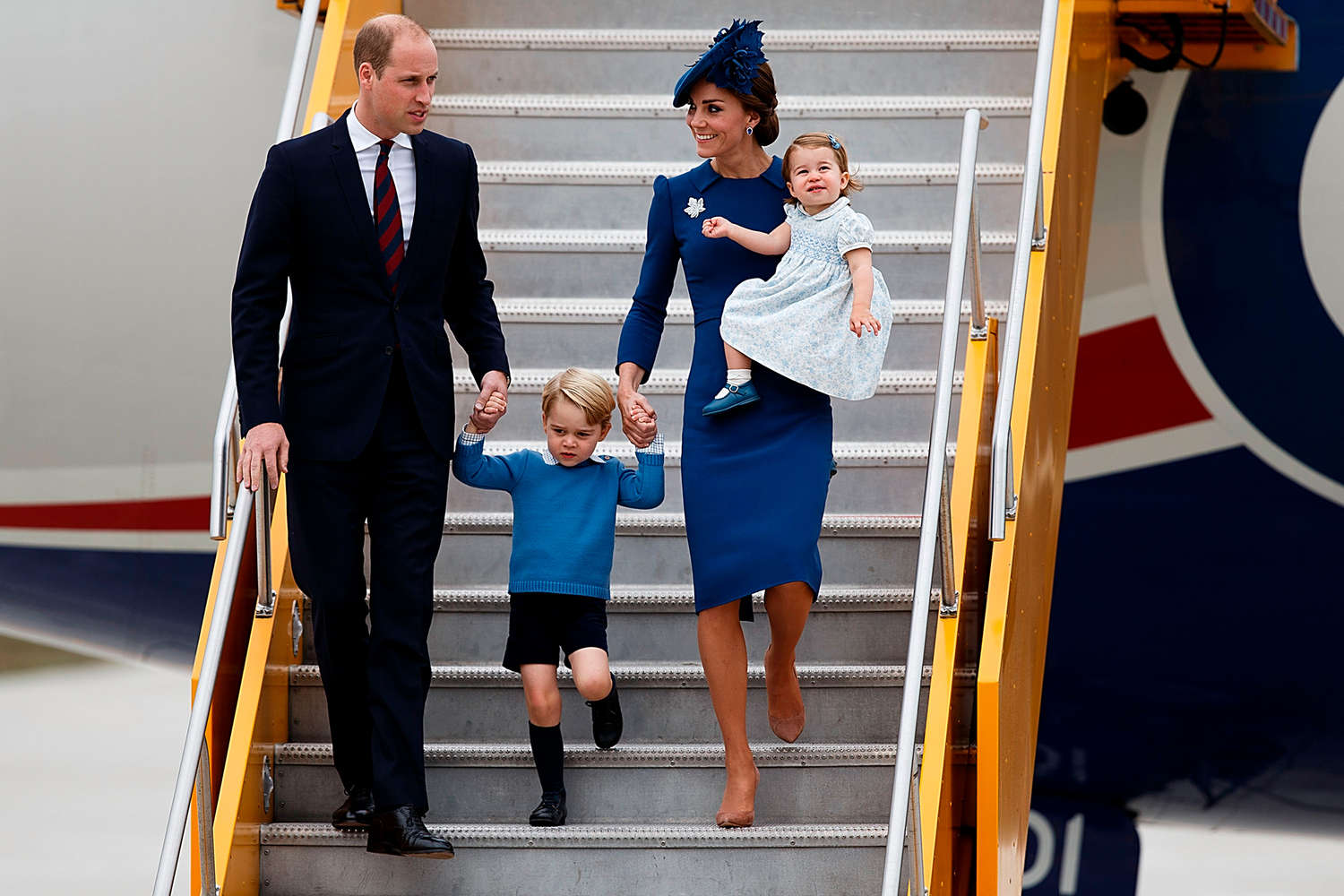 Принц Уильям, герцог Кембриджский, принц Джордж Кембриджский, Кейт, герцогиня Кембриджская и принцесса Шарлотта Кембриджская прибывают в 443-ю морскую вертолетную эскадрилью 24 сентября 2016 года в Виктории, Канада