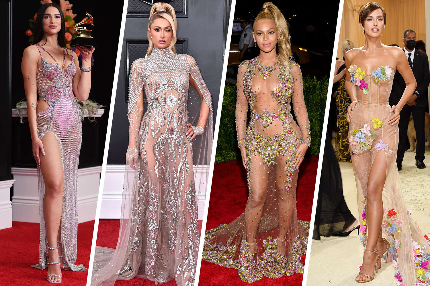 Телесные платья чаще всего декорируются вышивкой, как в случае с образом Пэрис Хилтон для Grammy-2022, либо инкрустируются камнями и стразами. За примерами расшитых кристаллами нарядов далеко ходить не нужно: Дуа Липа, Бейонсе и Ирина Шейк регулярно появляются в них на публике.