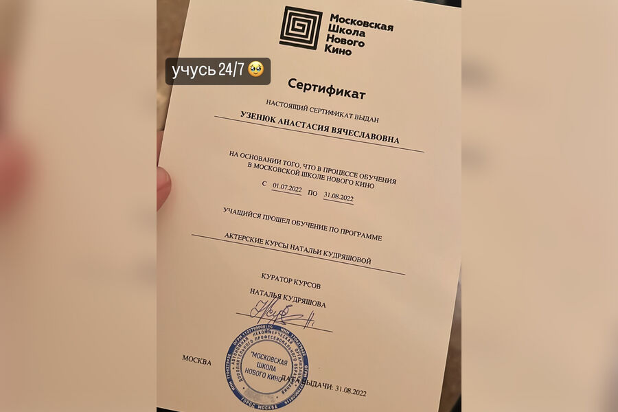 Настя Ивлеева опубликовала в социальных сетях фотографию сертификата об окончании обучения в Московской школе нового кино. Примечательно, что в документе указана фамилия бывшего супруга звезды — Алексея Узенюка, выступающего под творческим псевдонимом Элджей, — а не ее девичья. Либо девушка решила оставить фамилию рэпера после развода, либо их брак официально расторгнут не был.