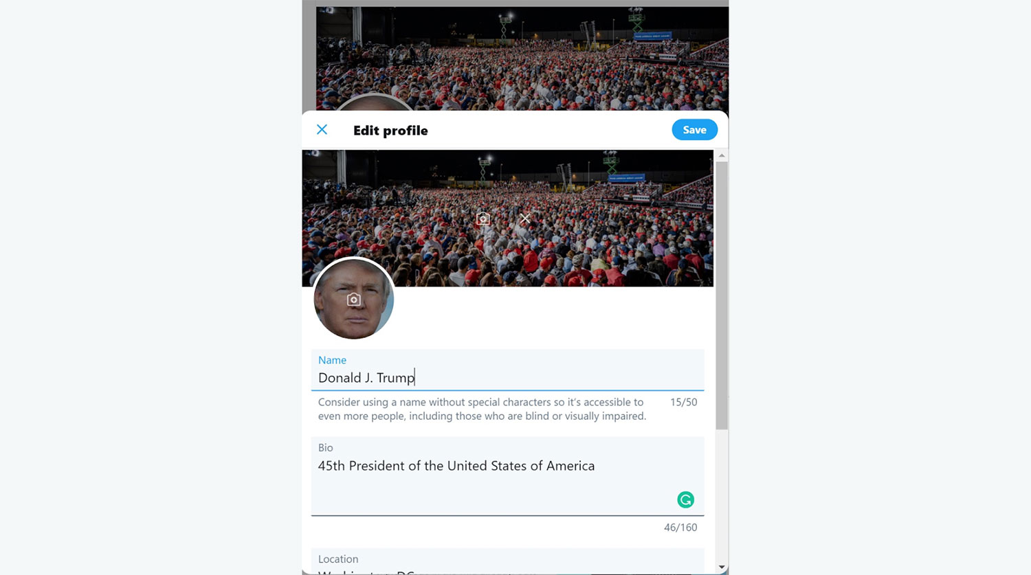 В разделе «Био» можно увидеть фразу «45th President of the United States» (рус. «45-й президент Соединенных штатов»), длина которой составляет 46 символов. Эта фраза действительно присутствует в профиле главы государства, но в ее конце также размещен эмодзи американского флага. В итоге вся биография Трампа вместе с эмодзи должна занимать 50 символов, а не 46, как на присланном Геверсом скриншоте.
