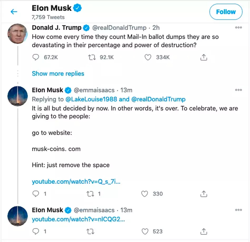 В ответ на пост Дональда Трампа о своей победе на выборах клон Илона Маска написал о том, что результаты уже предрешены, и это нужно отметить раздачей криптовалюты. Далее в посте была дана инструкция, следуя которой, пользователь должен был попасть на некий сайт.