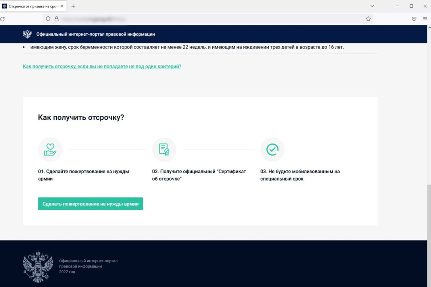 Обнаружен как минимум один фишинговый сайт, выдающий себя за официальный интернет-портал правовой информации РФ, который обещает некий «сертификат об отсрочке» на «специальный срок» за денежное пожертвование в пользу армии РФ. На этом же сайте мошенники предлагают ввести данные банковской карты и сделать перевод. В итоге злоумышленники получают конфиденциальную банковскую информацию жертвы и крадут деньги с карты.