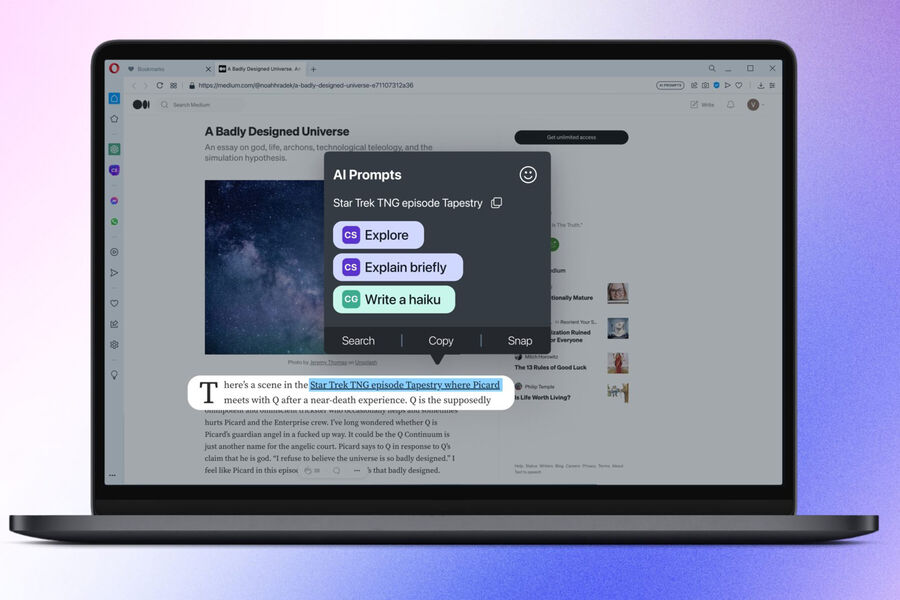 В браузерах Opera и Opera GX появились новые функции на базе искусственного интеллекта. Среди них контекстные подсказки AI Prompts, а также интеграция популярных сервисов ChatGPT и ChatSonic в боковую панель.