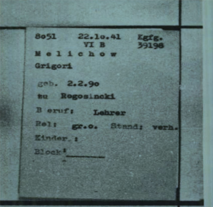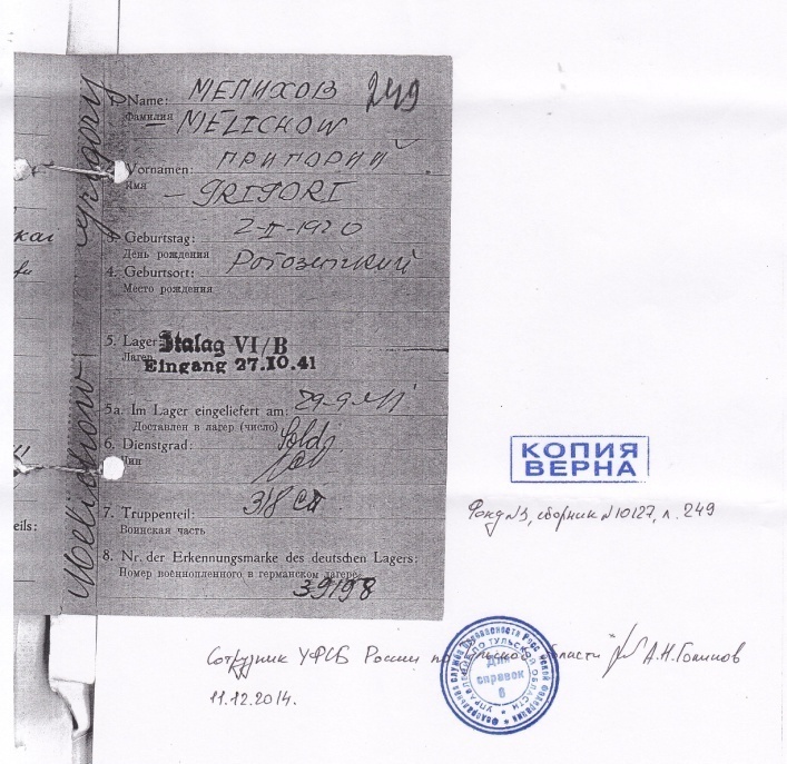 Копия учётной карточки Мелихова Г.И.из архива УФСБ России по Тульской области