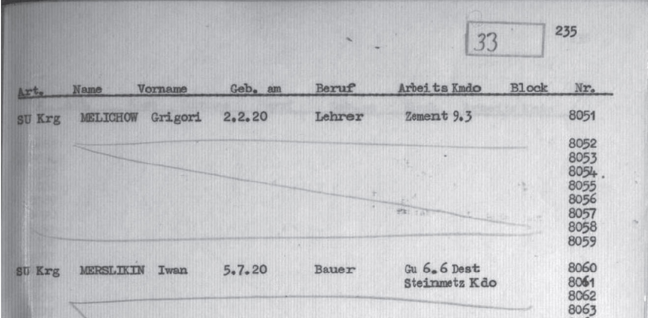 Так вот, 29-го нас построили на аппельплаце. Комендант в сопровождении эсэсовцев вышел к нам и объявил, что американцы вплотную подошли к лагерю и что немцы должны вести с ними бои. В целях сохранения наших жизней мы должны пойти в штольни. Старостин… переводил нам слова коменданта.… Когда полковник кончил переводить, все закричали: «Нет, не пойдём!». Старостин пригласил к себе старост бараков для разговора с комендантом. У старосты нашего барака №10, Отто, был пистолет, и перед тем как пойти к коменданту, он предупредил нас, что, если комендант даст команду гнать в штольни, он его убьёт, а мы должны выполнять свои задачи.