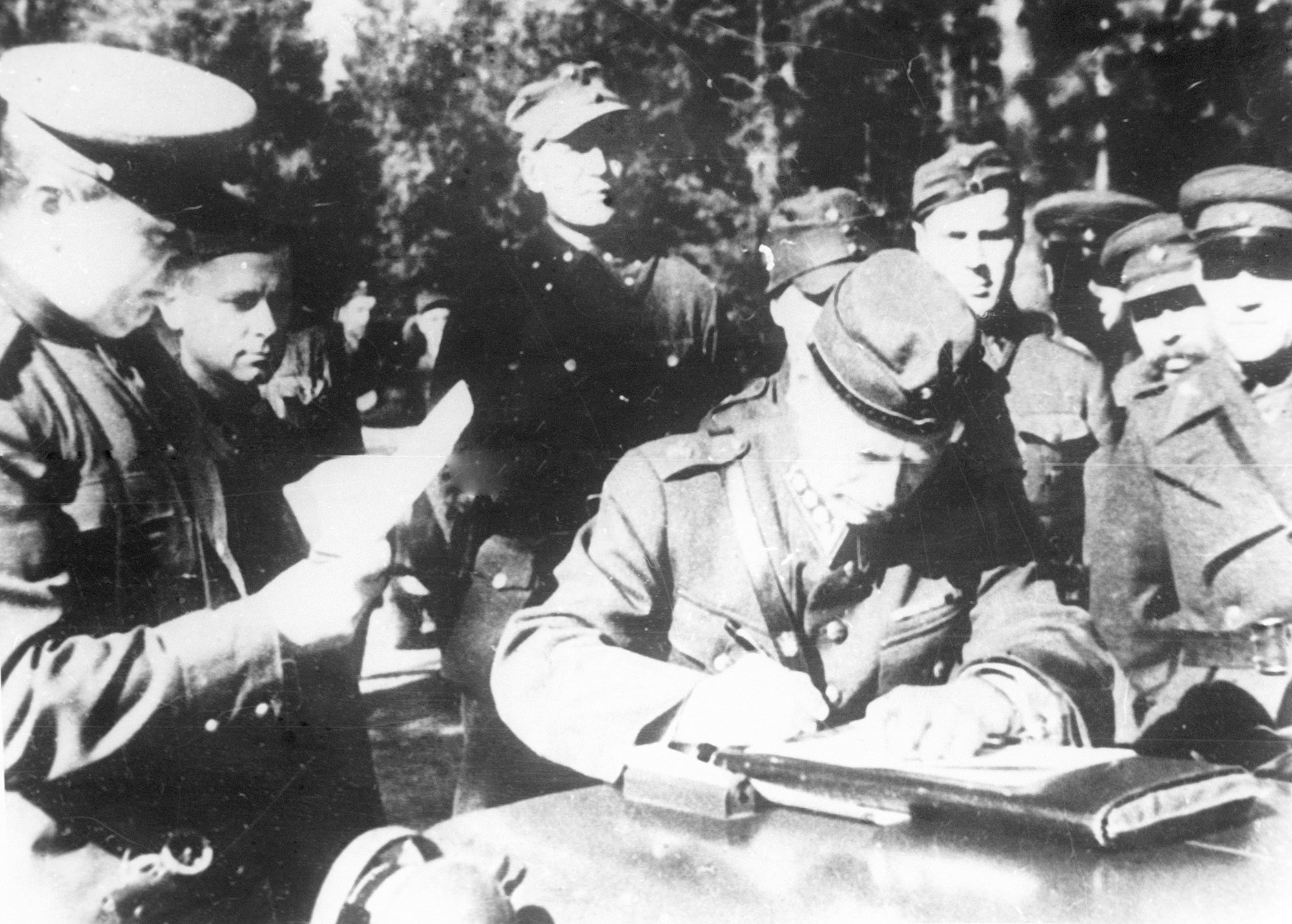 Подписание представителями финского командованияакта о сдаче пограничных участков.