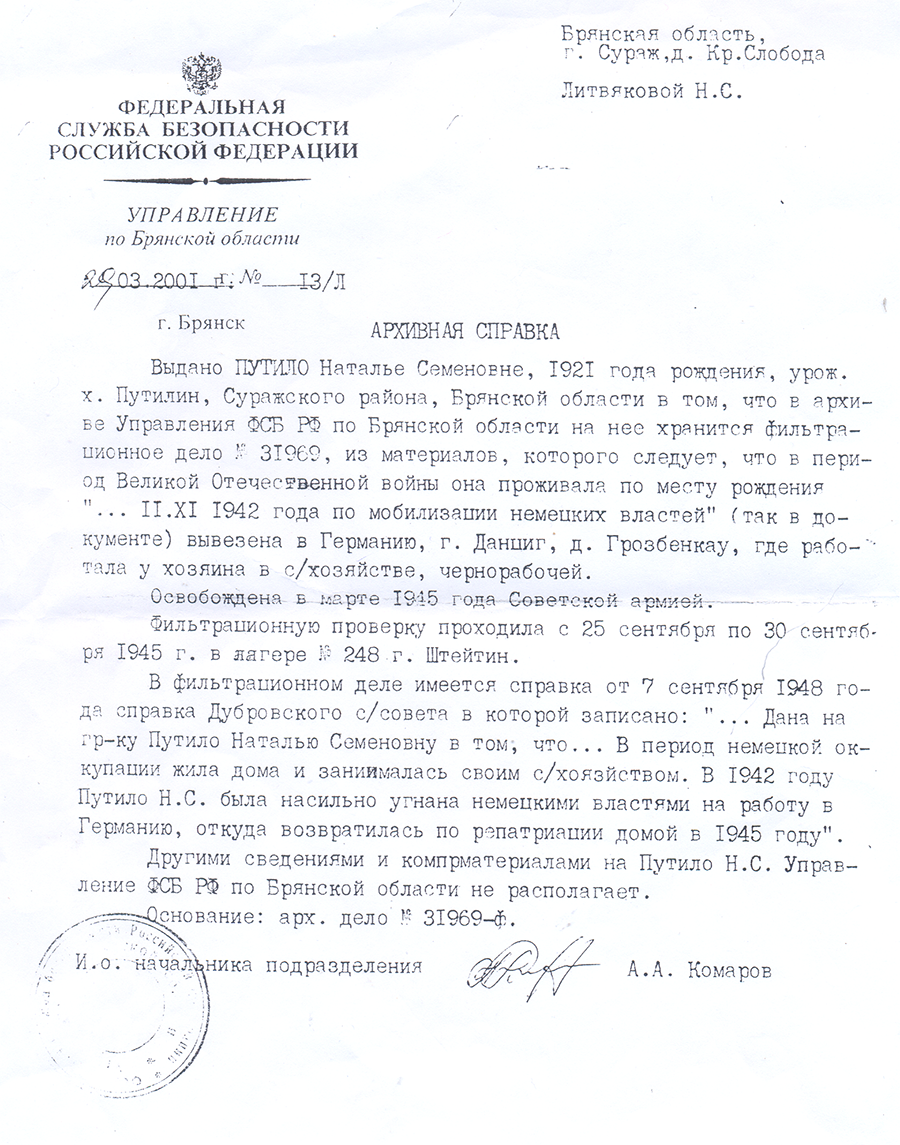 Домой Наталья вернулась только осенью 1945 года. «Каждый, кто принудительно или добровольно выехал в Германию на работу, после освобождения был опрошен (проходил фильтрацию — по терминологии НКВД)». Проходила проверку Наталья Семёновна Путило в сентябре 1945 года в лагере № 248 в городе Штеттин. По результатам опроса составлялось фильтрационное дело. Дело направлялось в область, куда человек возвращался после освобождения. Допрос Наталья Семёновна вспоминать не хочет. Уже в родном хуторе к ней не раз будут приходить с вопросами о жизни в Германии, запугивая выбивать «правду». На защиту встанет семья и односельчане. В историю войны Наталья Путило вошла как «гражданка, вывезенная на принудительные работы». В военные годы это была «чёрная метка» для тех, кто выжил и вернулся из немецкого плена. Их считали предателями, ограничивали в правах. И только в 90-е годы эти люди смогут поднять голову и рассказать, не скрывая, о пережитом в Германии.