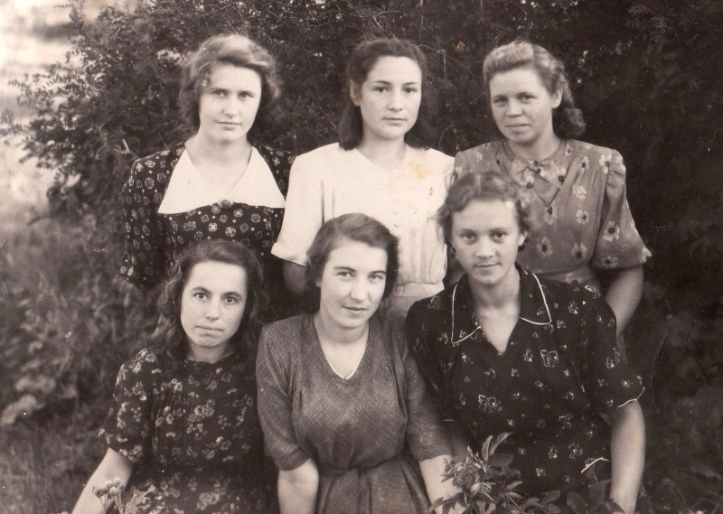 1948 год. Р. Крюкова, К. Иванова, Р. Тимонова,Т. Севастьянова, Н. Лифанова, В. Теплова, М. Иванова