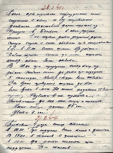 Ещё один рассказ моего прадеда не оставил меня равнодушным. <...> Я хочу рассказать о таком случае, произошедшем 20 августа 1941 года. «Я находился на наблюдательном пункте со старшим лейтенантом. Работали на стереотрубе, передавали на командный пункт о движении к опушке леса немецких танков, они по 8 штук выдвигались к линии фронта для наступления. Я насчитал 5 танков, успел передать на командный пункт, вдруг у меня звон в ушах и я внезапно оказался вниз головой. Опомнился, огляделся. Стереотруба оказалась разбитой, моя винтовка погнута, а деревянная часть винтовки изуродована. В кармане у меня была алюминиевая ложка, которая оказалась свёрнута в комок. Оказалось, у меня рана в ногу и в руку. Тяжело вспоминать, как трудно было на фронте в августе 1941 года». <...>