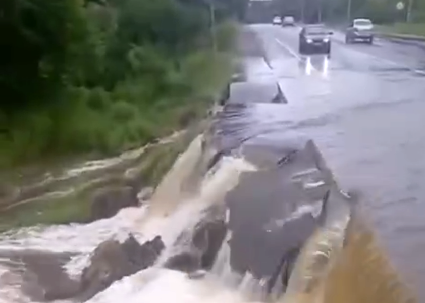 На кадрах видно, что сильный поток воды движется поперек проезжей части, при этом у обочины на дороге размыло асфальт и грунт, образовался небольшой водопад. По уцелевшей части дороги на небольшой скорости проезжают легковые автомобили.