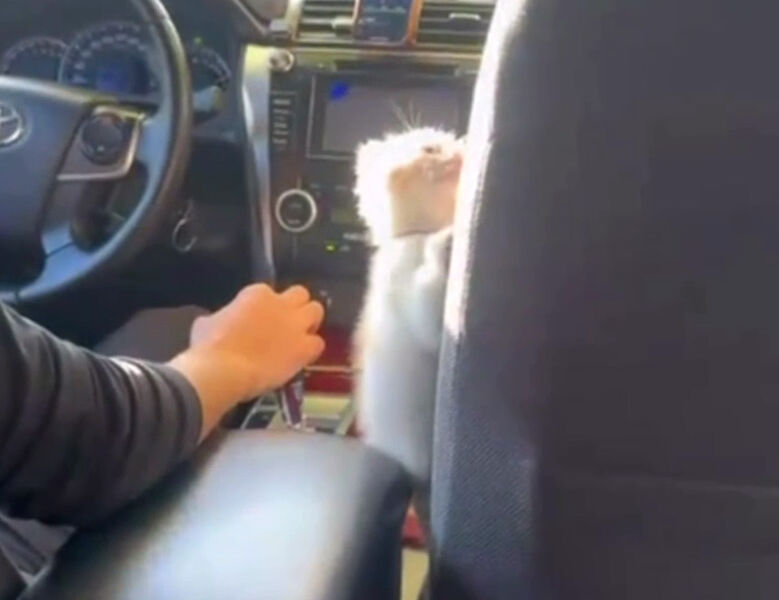 На опубликованных в сети кадрах видно, что во время поездки животное находится на переднем сиденье, при этом котенок пытается забраться на спинку.