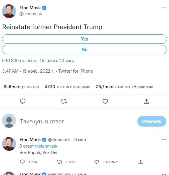 Ранее предприниматель и владелец Twitter Илон Маск сообщил, что опрос о возвращении аккаунта экс-президента США Дональда Трампа в социальной сети поможет доработать систему голосования.
