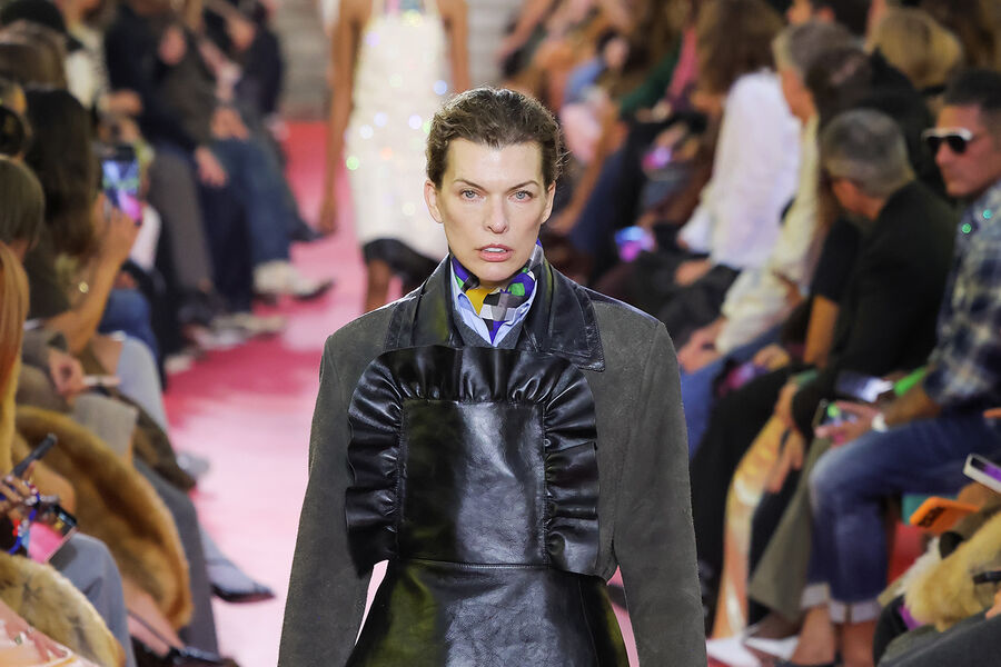 Милла Йовович приняла участие в показе бренда Miu Miu, который прошел 6 октября в рамках Недели моды в Париже. Актриса вышла на подиум в темно-серой замшевой куртке, голубой рубашке с платком, черном кожаном фартуке и босоножках на каблуках. Знаменитости уложили волосы и сделали макияж в естественном стиле.