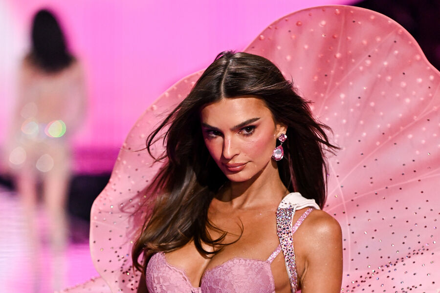 34-летняя Эмили Ратаковски появилась на подиуме в розовом кружевном комплекте белья, который состоял из бюстгальтера и стрингов. Модель также надела серьги с массивными камнями, длинные перчатки и сияющие босоножки на каблуках. На спине манекенщицы были прикреплены огромные розовые лепестки цветов, украшенные сверкающими пайетками. Знаменитости уложили волосы и сделали макияж.