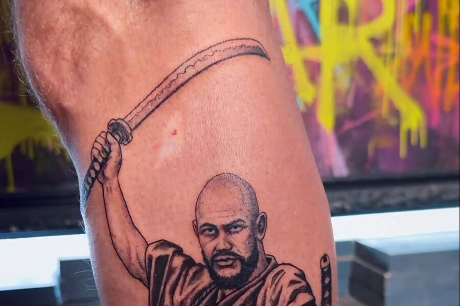 Джиган посетил мастера по тату вместе со своим сыном Давидом. Рэперу сделали на ноге татуировку — самурая, который держит в руках мечи. Рядом с исполнителем в костюме война сидел его наследник.