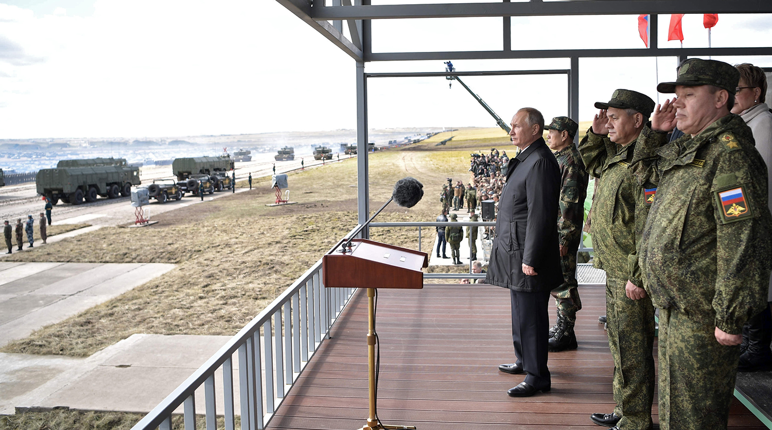 Владимир Путин с помощью бинокля наблюдает за происходящими на полигоне событиями. Посмотреть здесь действительно есть на что: новые боевые подразделения вступают в бой практически ежесекундно, а сами боевые действия выглядят все масштабнее каждую минуту. Слева от главнокомандующего сидит начальник российского Генштаба Валерий Герасимов, который переодически что-то говорит президенту, справа — министр обороны Сергей Шойгу.