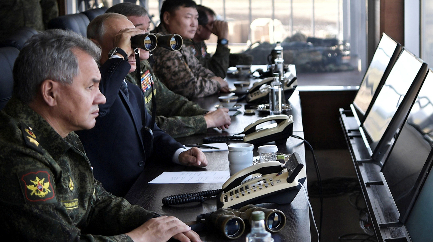 Президент России Владимир Путин и министр обороны Сергей Шойгу в командном пункте на забайкальском полигоне «Цугол» во время военных маневров «Восток-2018», 13 сентября 2018 года