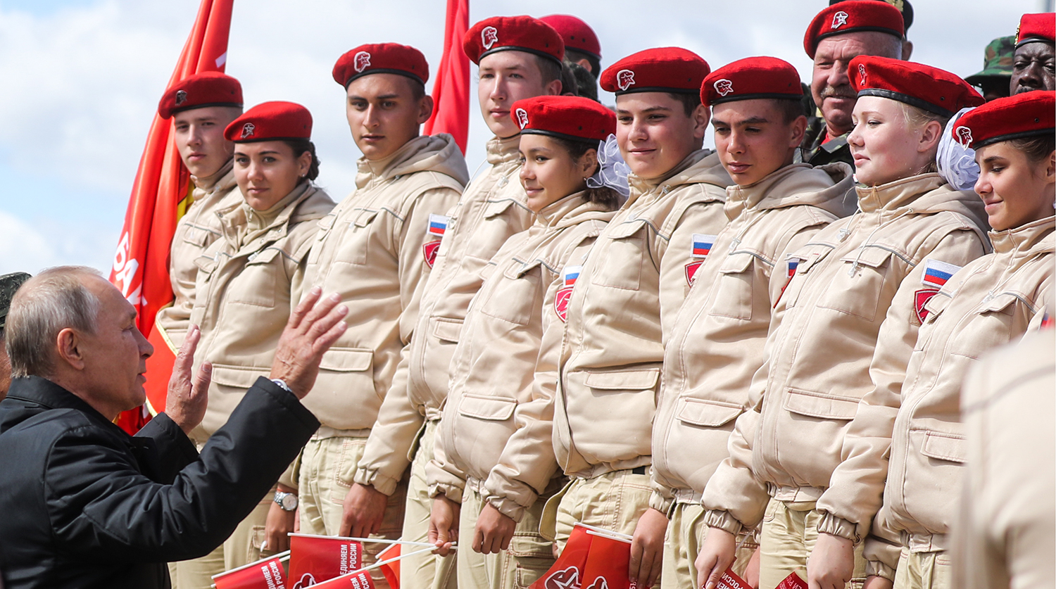 Президент России Владимир Путин с участниками «Юнармии» на полевом смотре войск во время военных маневров «Восток-2018» на забайкальском полигоне «Цугол», 13 сентября 2018 года