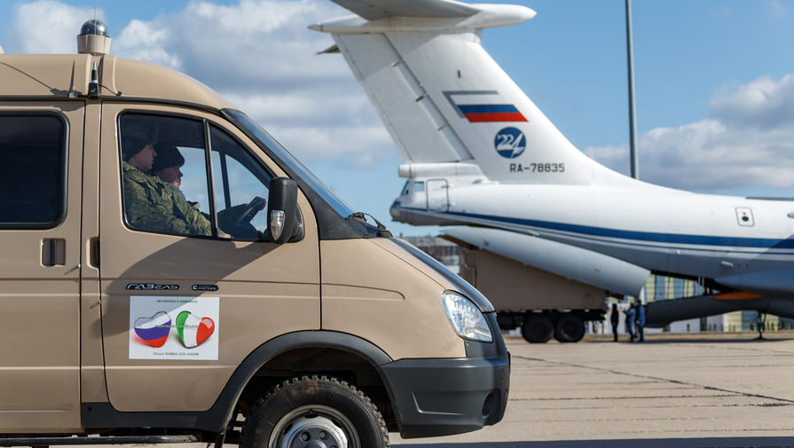 Уже в середине дня в воскресенье первый самолет Ил-76 ВКС России вылетел с Чкаловского с российскими военными специалистами и оборудованием в Итальянскую Республику. Лайнер направился на авиабазу ВВС Италии «Практик де Маре» (30 км юго-западнее Рима). В самолете находилась передовая группу военных медиков.