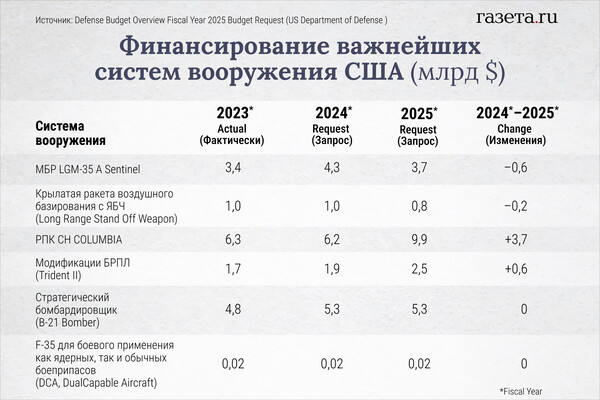 Рекапитализация ядерных платформ, систем доставки и связанных с ними систем поддержки потребует значительных инвестиций в течение следующих 20 лет, полагают в минобороны США. В следующей таблице отражено финансирование шести важнейших систем вооружений.