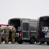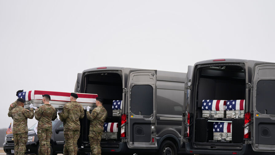 Солдаты армии США переносят гробы с останками погибших в результате удара беспилотника по командному центру в Кувейте после начала военной кампании США и Израиля против Ирана, март 2026 года