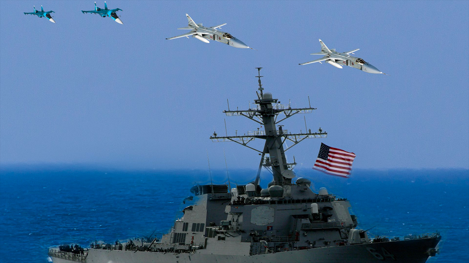 Украинская сторона полагает, что российские бомбардировщики СУ-24М под прикрытием истребители Су-27 совершили авиационный удар крылатыми ракетами по эсминцам США в Черном море. Об этом сообщило командование Воздушных сил ВСУ в Facebook, схематично показав, как бы это выглядело.
