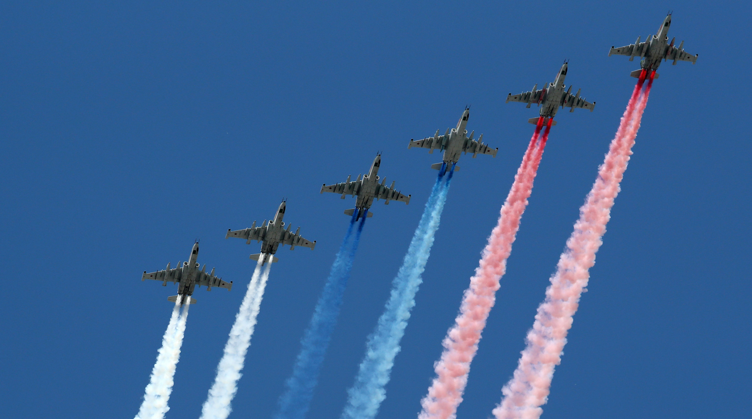 Самолеты во время проведения парада Победы в Москве окрасили небо в цвета российского флага. Трансляцию вел телеканал «Россия-24».