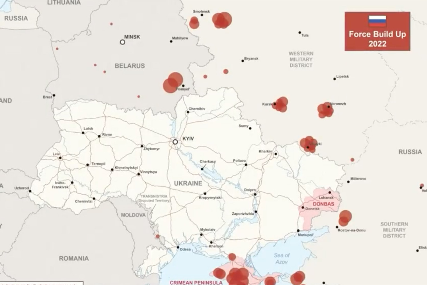 В видео, в котором ведомство ссылается на «данные разведки», продемонстрированы две фазы сухопутного наступления — с севера и с юго-востока. В рамках первой фазы последует нападение на Киев и Днепр, с территории Крыма — вдоль Азовского побережья и с территории Белоруссии на Киев.
