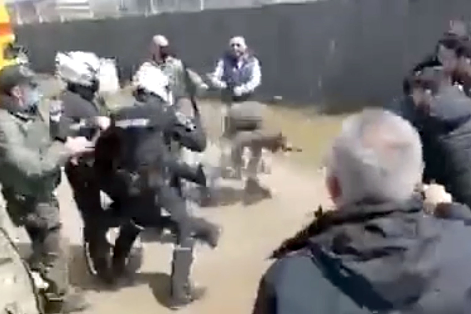 Момент столкновения портовых рабочих с полицейскими попал на видео. На кадрах видно, как мужчины нападают на правоохранителей, за которыми находится военная техника и грузовики. После этого около 15 митингующих направляются дальше, где снова сталкиваются с полицией.