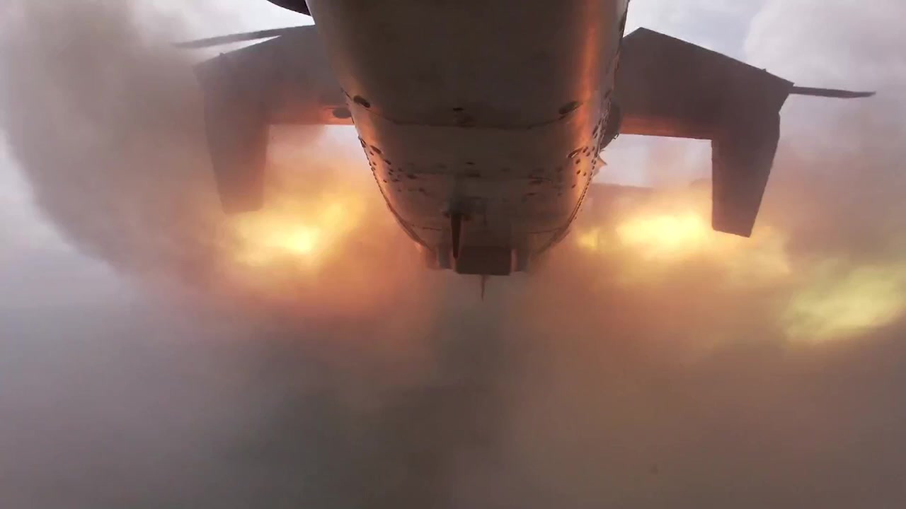 На кадрах видно, как вертолеты сначала готовятся к вылету, а затем наносят удары ракетами по военной технике противника.