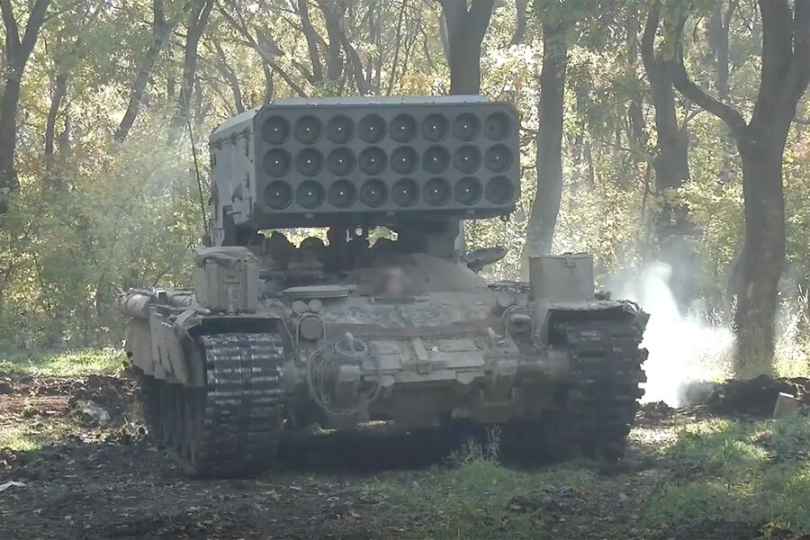 Минобороны РФ опубликовало видео применения тяжелой огнеметной системы (ТОС) 1А «Солнцепек». Виде размещено на сайте информационного агентства ТАСС.