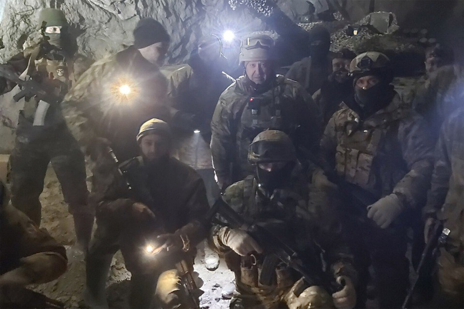 Основатель частной военной компании «Вагнер» Евгений Пригожин опубликовал фотографию, на которой он находится в подземелье Соледара на фоне танка, окруженный вагнеровцами.