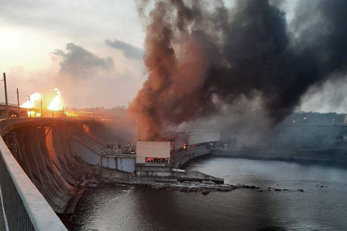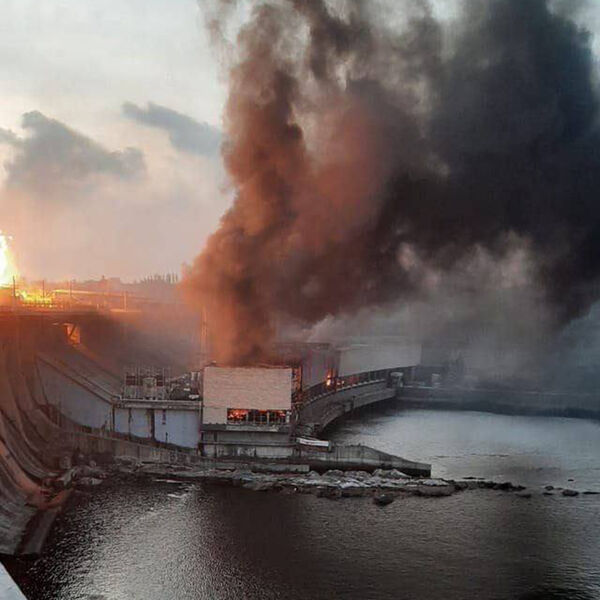 В социальных сетях распространяются кадры, на которых запечатлены ракетные удары по Днепровской ГЭС. На видео показан полет снарядов и их попадание в инфраструктуру ГЭС, что привело к возникновению пожара.