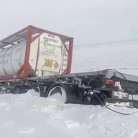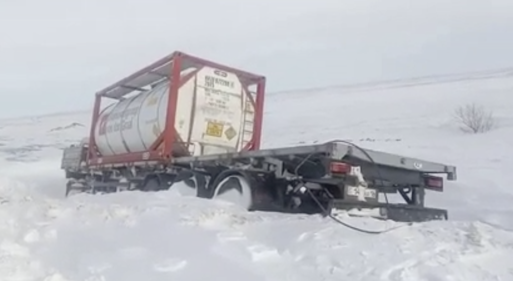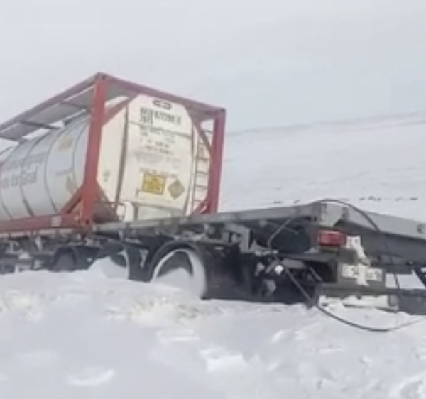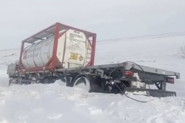 Сообщается, что метель не дает груженым автомобилям преодолевать сложные подъемы, из-за чего две тяжелых фуры сошли с дороги.