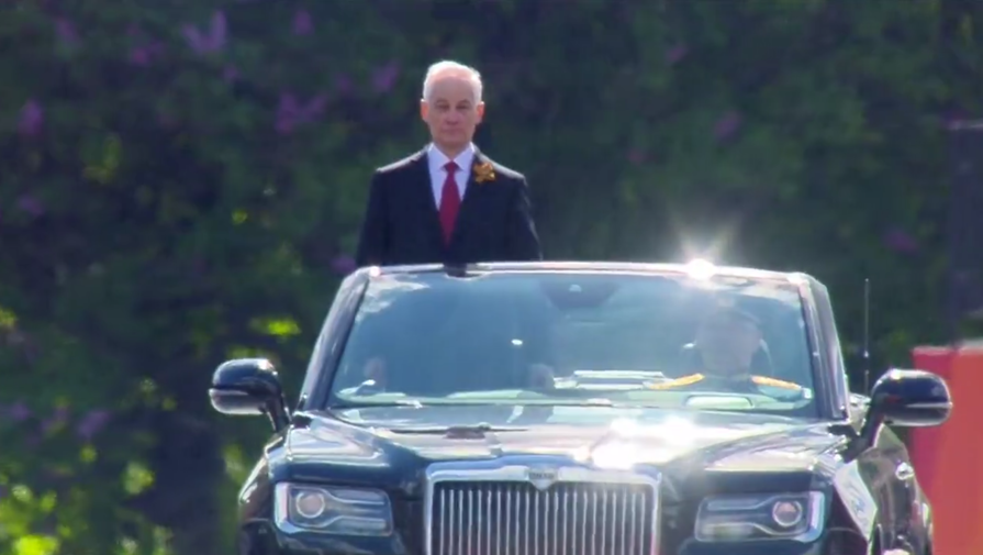 Белоусов принимает парад в честь 80-летия Победы в строгом черном костюме