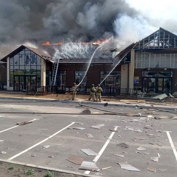 У здания повреждены крыша, фасад и окна. Возник пожар, площадь возгорания составила около 400 квадратных метров. На месте работают пожарные расчеты, огонь локализуют.