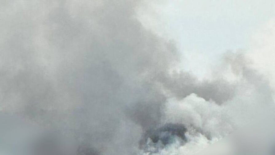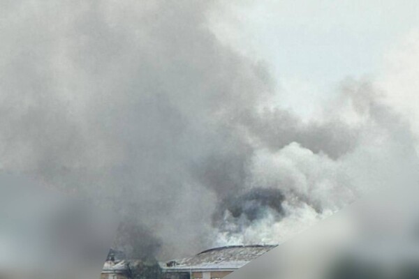 На кадре можно увидеть здание с сильными повреждениями и копотью на верхнем этаже. Строение практически полностью обволокло густым серым дымом, который возник из-за возгорания после атаки БПЛА.