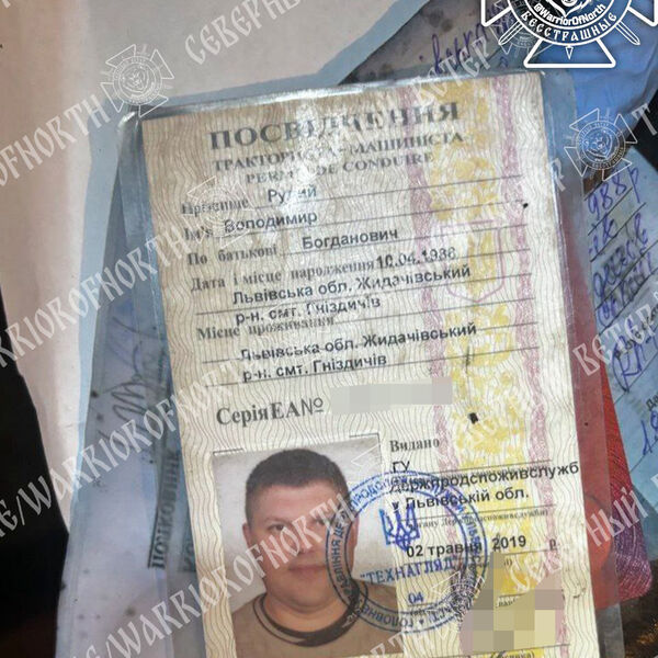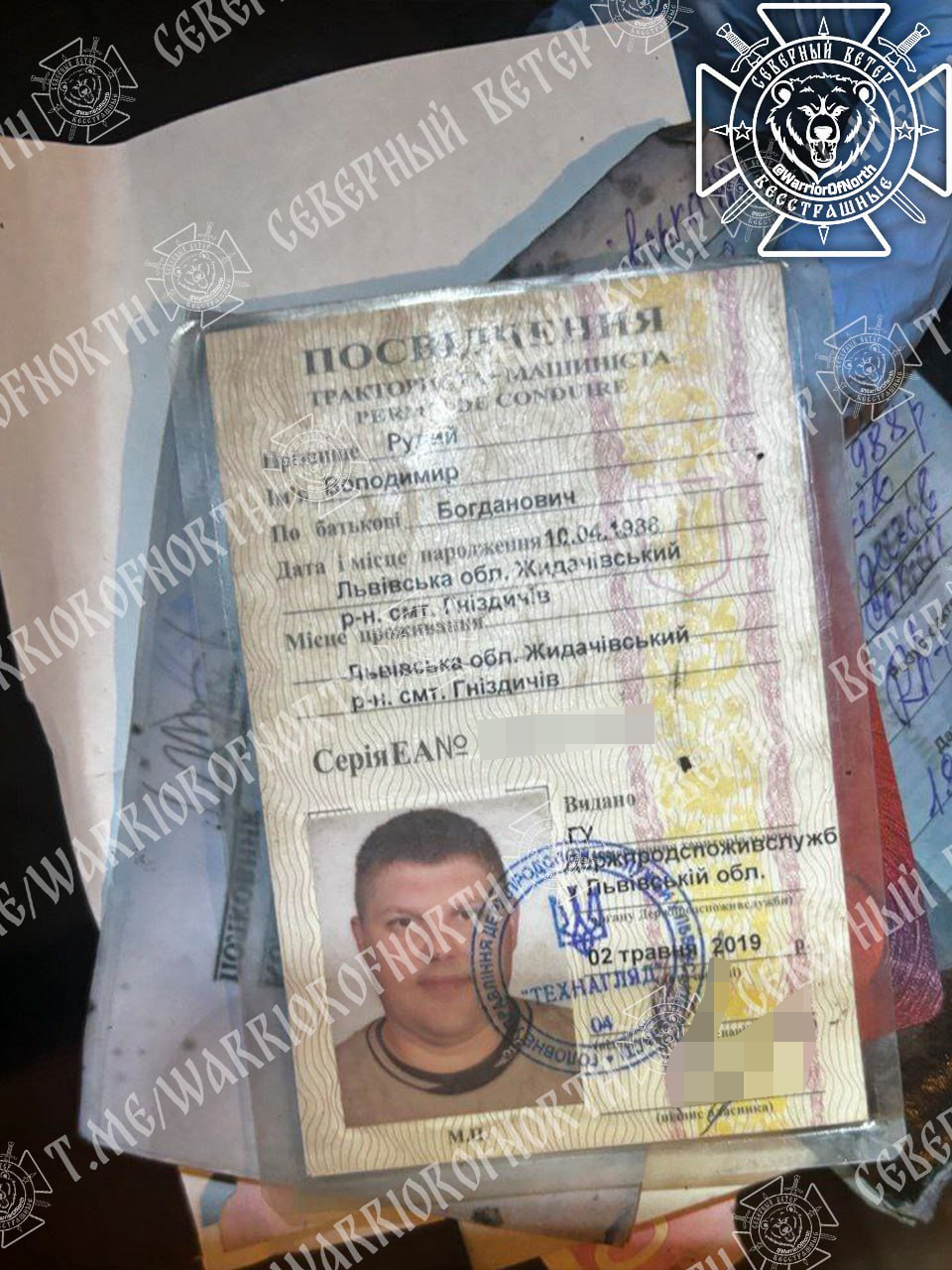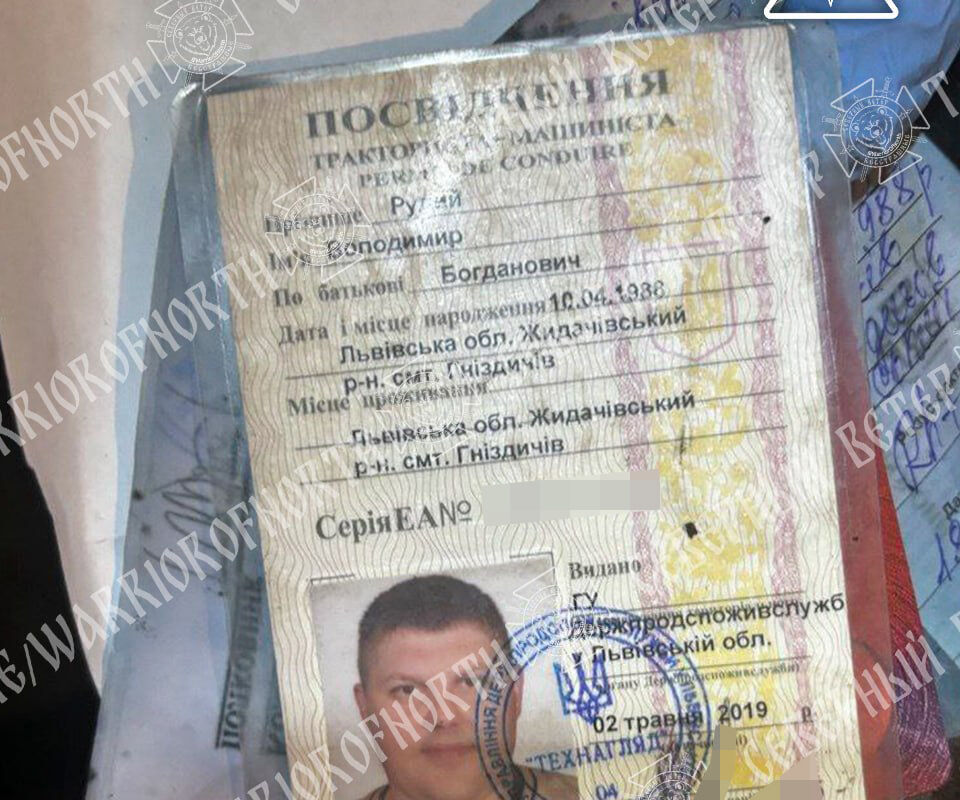 Речь идет об украинском военнослужащем по имени Владимир Рудый. На снимке показано удостоверение тракториста с его фотографией. На заднем фоне можно увидеть и другие документы мужчины, однако, что именно, понять по кадру невозможно. Из документов следует, что боец был родом из Львовской области, в апреле этого года ему исполнилось 39 лет.