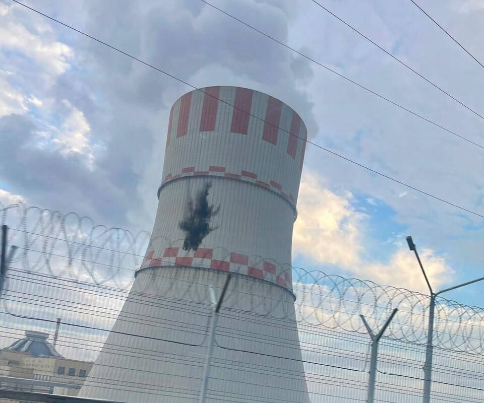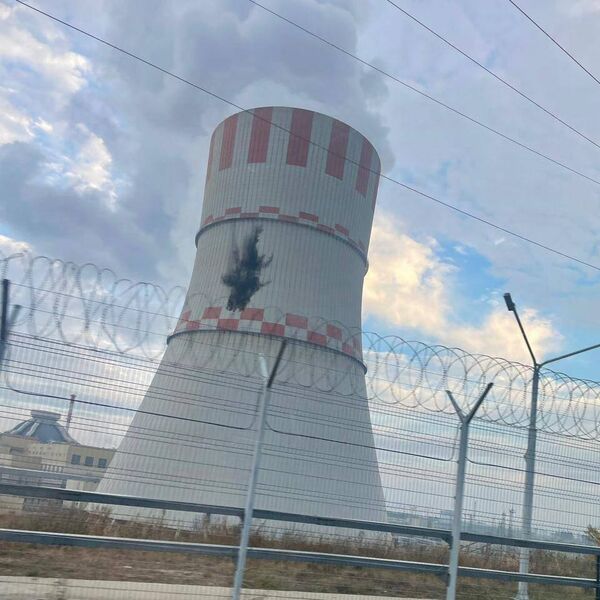 На кадре показана башенная испарительная градирня действующего энергоблока №6. В нее врезался украинский беспилотник, оставив след от взрыва. Судя по фотографии, серьезных последствий удалось избежать.