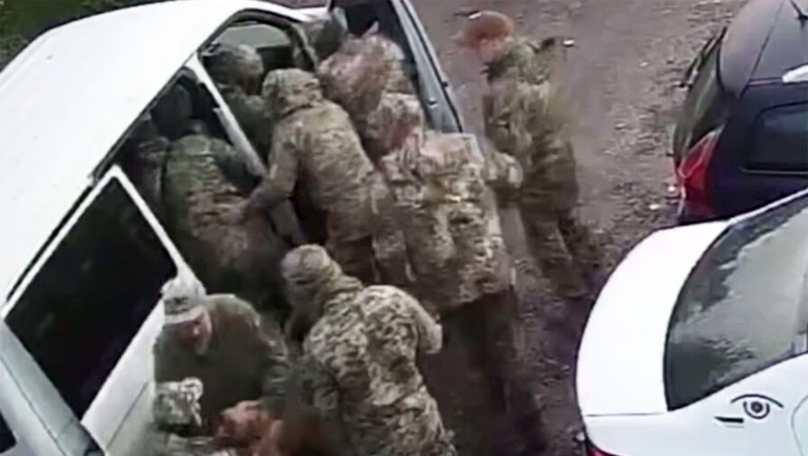 На опубликованных изданием кадрах видно, как около десяти мужчин в камуфляже силой усаживают мужчину в микроавтобус, после чего передают ему его собаку, закрывают дверь и уезжают.